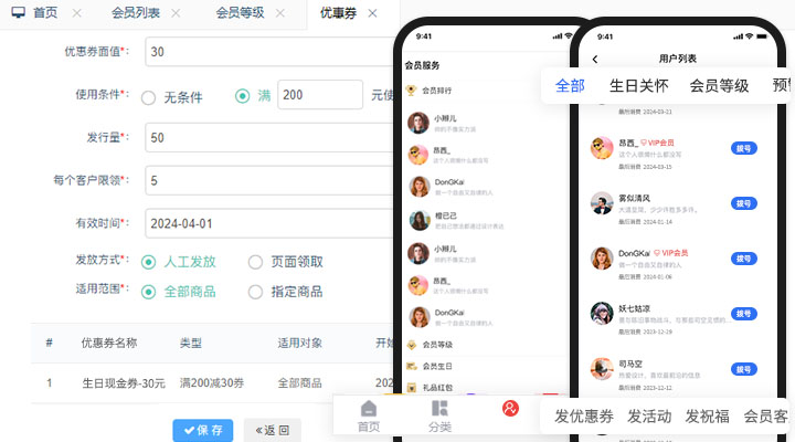 支持微信会员卡,支持会员分级营销